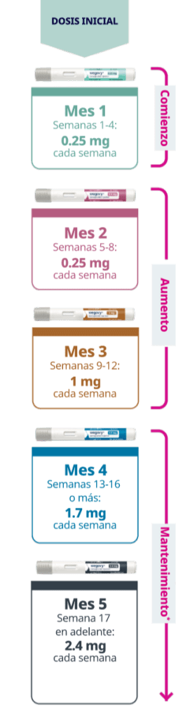 Está disponible en 5 dosis diferentes, que van desde 0.25 mg hasta 2.4 mg. Cada dosis viene en una pluma de diferente color. Tu médico aumentará tu dosis con el tiempo hasta que alcances tu dosis de mantenimiento