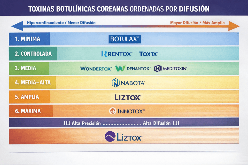 Basado en comportamiento clínico real (no fichas técnicas), las toxinas coreanas pueden ordenarse, de menor a mayor difusión, de la siguiente forma:
